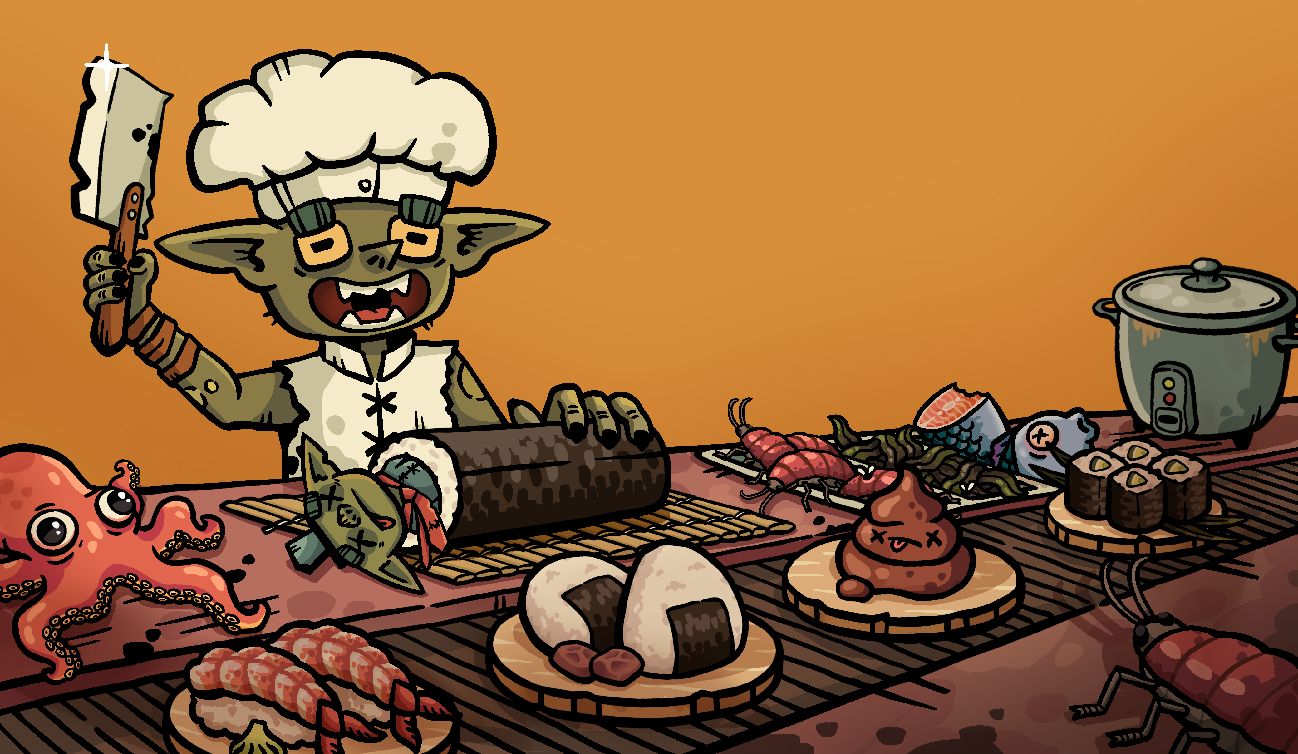 Roll a huge selection of delicious looking sushi. Made from everyday goblin cave ingredients: caterpillars, slugs, chicken heads, and freshly blended toads.